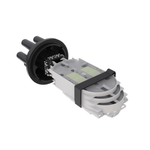 Base, abraçadeira de fechamento, bandeja para acomodação de emenda, kit para fixação do elemento de tração, anel de vedação, cúpula e reserva de tubo loose.