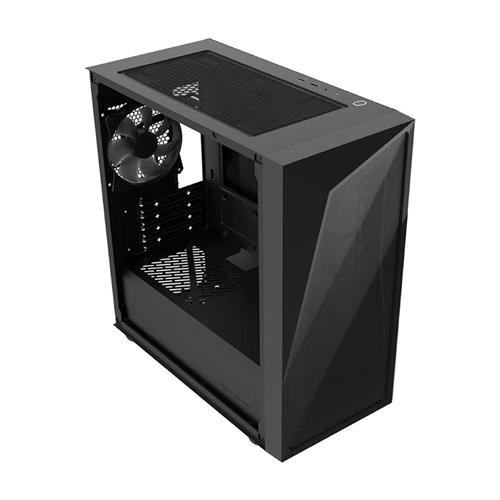 O painel frontal de geodo exclusivo da CMP 320L permite fluxo de ar irrestrito e térmicas ideais, possui revestimento preto completo e tampa da fonte de alimentação respirável.