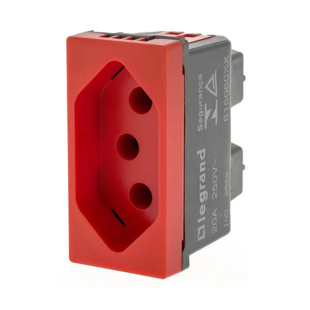 A Tomada 2P+T 20A 250V com borne de parafuso e módulo único (1M) na cor vermelha é ideal para instalações elétricas que exigem alta capacidade de corrente.
